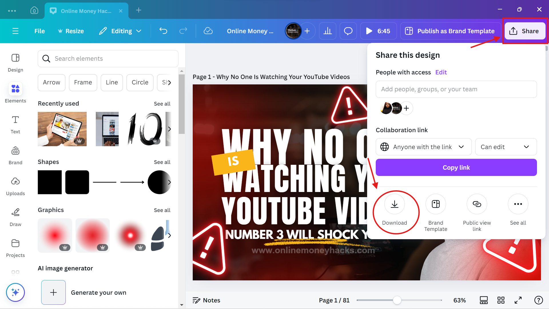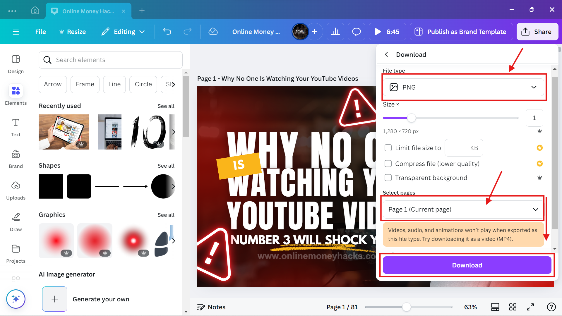 • Download Options: Once you’re happy with your thumbnail, click the “Share” button at the top right and select “Download.” You can choose your file type, though JPEG or PNG are the most common for YouTube thumbnails. If you have multiple designs in one page, you can select the page you want to download and proceed to download
