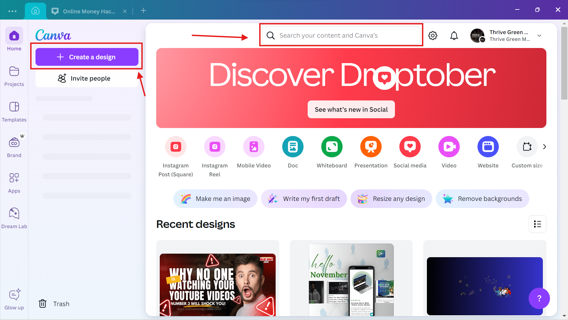 The dashboard is your starting point. From here, you can explore YouTube thumbnail templates on Canva or click “Create a design” to start a new project.