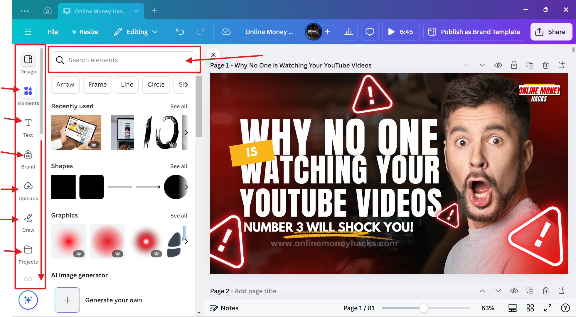 • Elements: This tab contains design elements like shapes, icons, frames, and much more, simply use the search if what you need is not visible when you click on elements. These can add visual interest to your thumbnail and highlight specific parts of your image or text.